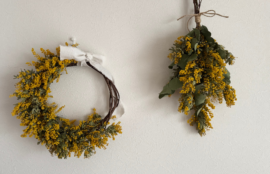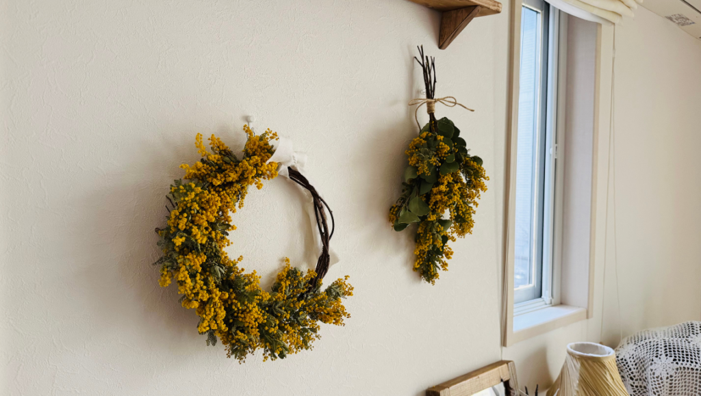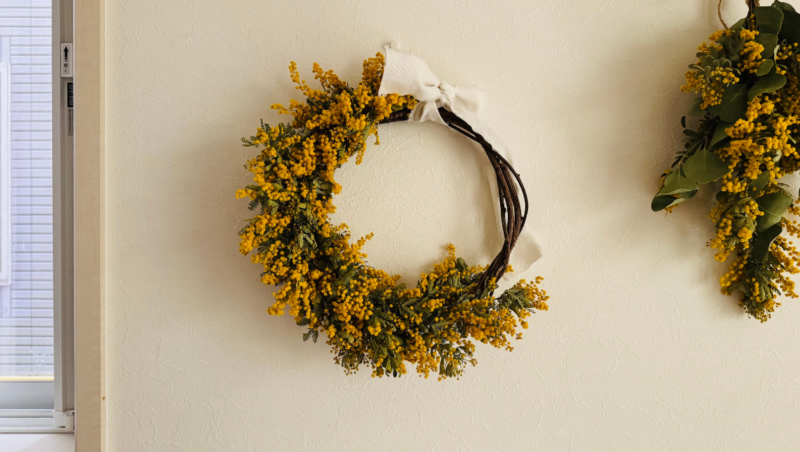 庭のミモザが、ふわふわの黄色い花をいっぱいに咲かせました。 あまりに綺麗だったので、サロンに飾るリースとスワッグを手作りしました。
